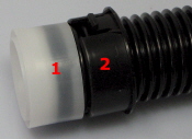 Om te controleren of u de slang uit elkaar kunt halen doet u het volgende. U klikt met een schroevendraaier het nokje naar beneden. Dit doet u aan twee kanten. Vervolgens valt de wartel of het handvat van de slang en houd u een slang met schroefbusje (1) en klikring (2) over. Het schroefbusje kan op de slang gekit zitten. U kunt deze van de slang snijden met een schilmesje en vervolgens een nieuw busje met schroefdraad kopen om deze weer opnieuw op de slang te zetten. Om het geheel nog iets beter op zijn plaats te houden kunt u het schroefbusje voor u het op de slang schroeft even in smeren met PVC lijm. Op deze manier kunt u de slang een stukje inkorten of een nieuwe slang monteren.