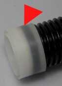 Om te controleren of u de slang uit elkaar kunt halen doet u het volgende. U klikt met een schroevendraaier het nokje naar beneden. Dit doet u aan twee kanten. Vervolgens valt de wartel of het handvat van de slang en houd u een slang met schroefbusje (1) en klikring (2) over. Het schroefbusje kan op de slang gekit zitten. U kunt deze van de slang snijden met een schilmesje en vervolgens een nieuw busje met schroefdraad kopen om deze weer opnieuw op de slang te zetten. Om het geheel nog iets beter op zijn plaats te houden kunt u het schroefbusje voor u het op de slang schroeft even in smeren met PVC lijm. Op deze manier kunt u de slang een stukje inkorten of een nieuwe slang monteren.